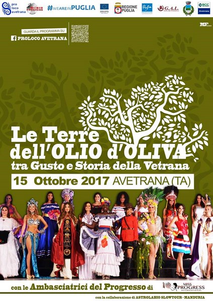 L’evento in questione, da come affermano gli organizzatori ed il progettista Giovanni Melinossa, ha l’obiettivo di promuovere la cultura nostrana, attraverso la messe in opera di percorsi turistici e gastronomici. Infatti in mattinata, si coglierà l’occasione di dare il benvenuto alle Ambasciatrici del Progresso, del concorso di Miss Progress International, la cui finale sarà venerdì 20 ottobre alle ore 21.00 presso il Teatro Comunale di Carosino. Le ragazze saranno accolte, dunque, con una cerimonia di accoglienza. I percorsi gastronomici, saranno incentrati totalmente sulla degustazione de prodotto tipico d’eccellenza: l’Olio Extra Vergine d’Oliva. La presenza degli ospiti internazionali, sarà l’occasione per presentare in tutto il mondo, il territorio di Avetrana, con le sue peculiarità, nonché importante vetrina per i prodotti tipici locali. Il suo territorio era già abitato durante il Neolitico, infatti in località Masseria Marina, a sud dell'abitato, sono venuti alla luce tracce di un villaggio preistorico, un agglomerato di capanne del VI millennio a.C. Altro luogo frequentato nel neolitico sono le grotte nel Canale di San Martino, i cui reperti sono custoditi nel Museo Nazionale di Taranto. Il paese attuale sorge sul secondo tracciato dell'importante arteria stradale che in epoca messapica prima e successivamente in quella romana collegava Taranto, Manduria, Nardò, Leuca e Otranto: La "Via Traiana Messapica", detta anche "Via Sallentina". Con il nome di "Vetrana", si intende quel feudo di diverse famiglie durante la tirannide feudale. Nel 1481 passò alla signoria dei Pagano, come dote di Ippolita, figlia di Francesco Montefuscoli, che sposa Galeotto Pagano. Sotto i Pagano si iniziò la costruzione della nuova chiesa matrice e della cinta muraria, di cui oggi rimangono visibili solo pochi resti, il Torrione dunque.