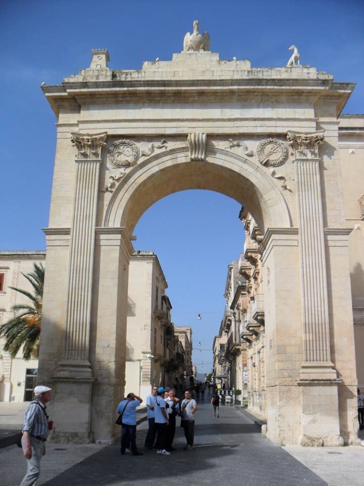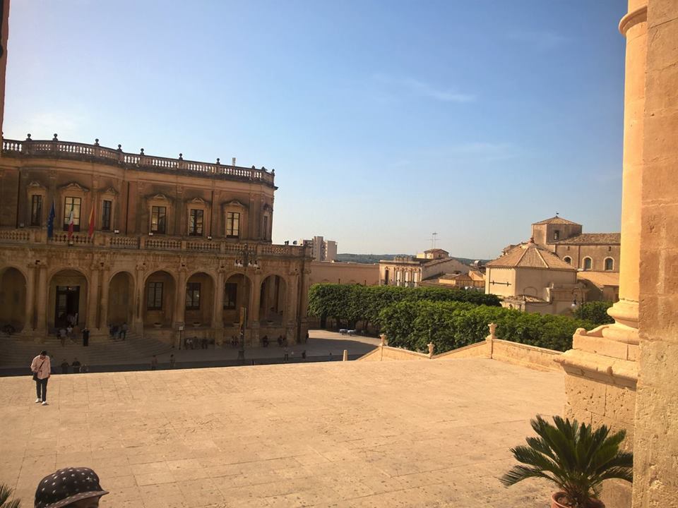 Non possiamo fare a meno d’una sosta nella città definita capitale del barocco siciliano. Noto fu riedificata interamente dopo il distruttivo terremoto del 1693, ma su un nuovo sito. Entriamo dalla Porta Reale su corso Vittorio Emanuele. La chiesa di Santa Chiara, i magnifici palazzi, monumentali scalinate, il Palazzo Ducezio, la Cattedrale, le chiese di San Carlo e San Domenico, mostrano la loro bellezza, mentre il sole calante risalta le preziose architetture. La città, patrimonio dell’umanità, è un’autentica bomboniera. La via centrale che percorriamo è conquistata da visitatori incantati. La bellezza, sull’uno e l’altro lato del Corso, inebria. Stupenda la Cattedrale, con la facciata indorata dal sole, completata di recente nei lavori di restauro dopo il crollo della cupola nel 1996. In stile tardo barocco e in pietra calcarea tenera, ha un’impronta neoclassicista. Coronata dalle statue degli Evangelisti, opera dello scultore Giuseppe Orlando nel 1796, mostra nel primo ordine tre maestosi portali delimitati da colonne corinzie. L’ingresso centrale ha la porta in bronzo dello scultore Giuseppe Pirrone raffigurante alcune scene della vita di San Corrado Confalonieri, Patrono della città, le cui spoglie sono conservate all’interno in un’urna finemente lavorata a cesello. Il tempio s’erge sulla sommità d’una maestosa scalinata a tre rampe, d’origine settecentesca. L’interno è a croce latina su tre navate, con affreschi risalenti a metà del secolo scorso, realizzati dagli artisti Nicola Arduino e Armando Baldinelli. Nelle cappelle laterali diverse opere, tra le quali si segnalano un’Adorazione dei pastori di Giovanni Bonomo (1783), la tela Spasimo di Sicilia di Raffaele Politi (1809) ed alcune interessanti sculture. Ci resta solo il tempo per una granita rinfrescante e un cannolo, prorompente e immancabile dolcezza da gustare.