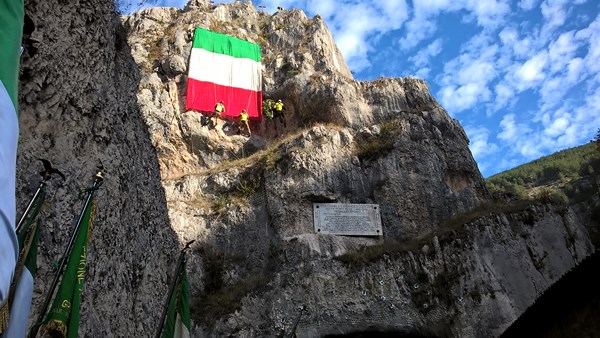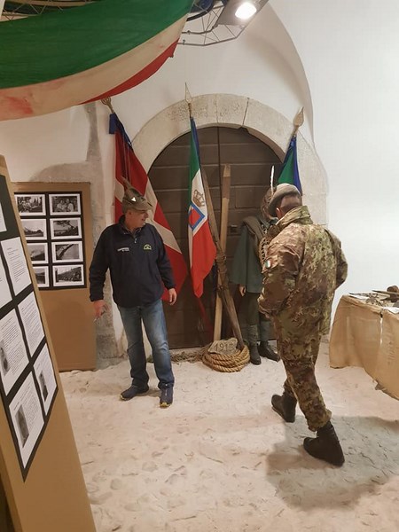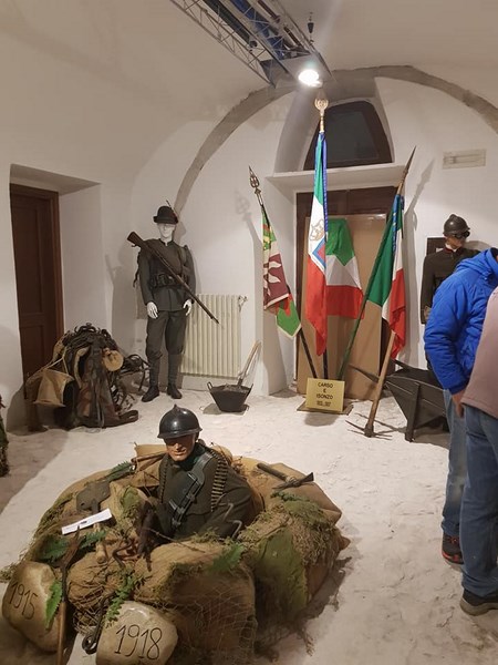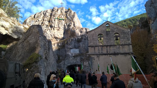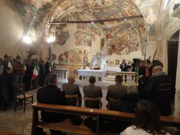 Al Col. Francesco Rossi sono state dedicate, in particolare, le manifestazioni del 12 novembre al Santuario della Madonna D’Appari, nei cui pressi è scavato nella roccia il Sacello che conserva le sue spoglie. Con una toccante e sobria cerimonia, seguita alla sfilata dei gruppi alpini delle Sezioni Abruzzi e Vittorio Veneto e delle associazioni d’Arma, partita dal monumento ai Caduti di Paganica, è stata deposta da alpini scalatori una corona d’alloro al Sacello, mentre dalla cima della roccia è stato calato un grande tricolore. Dopo gli onori militari la celebrazione eucaristica nello splendido Santuario, del XIII secolo, interamente affrescato, officiata da don Federico Palmerini. Nell’omelia, rendendo onore ai caduti della Grande Guerra, il celebrante ha richiamato la lettera che papa Benedetto XV rivolse il 1° agosto 1917 ai belligeranti perché cessasse la “inutile strage”, un’invocazione rimasta purtroppo senza esito. Ogni guerra lascia le motivazioni per quella successiva. Come Benedetto XV, anche altri pontefici, e da ultimi Giovanni Paolo II e papa Francesco, hanno invocato il dialogo e la mediazione diplomatica tra popoli per risolvere le controversie internazionali, essendo la Pace un valore universale. Per arricchire le due giornate di eventi è stata allestita nei locali del Palazzo Ducale di Paganica una Mostra Storica, che resterà aperta fino al 19 novembre. Vi sono esposti reperti e documenti inediti, divise e equipaggiamenti della Grande Guerra messi a disposizione dal 9° Reggimento Alpini “L’Aquila” e dall’associazione di Azione Civica “Jemo ‘Nnanzi”. La mostra è curata dal Gruppo Alpini e dal Nucleo di Protezione Civile ANA di Paganica. Questa che segue è la sintesi del contributo portato al Convegno da chi scrive.