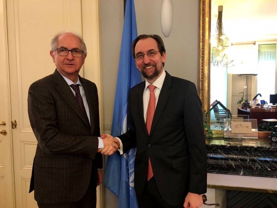 Ledezma se reunió este lunes en Ginebra (Suiza) con el Alto Comisionado para los Derechos Humanos de la ONU, Zeid Ra’ad Al Hussein, a quien le denunció que el pueblo venezolano es víctima de un genocidio, señalando que aquí el que no muere de hambre lo mata el hampa o el régimen. El Alcalde Metropolitano de Caracas en el exilio, se mostró muy satisfecho al saber que el Alto Comisionado de la ONU prepara un nuevo informe sobre el caso de Venezuela, e insistirá en que una comisión de su organismo, pueda hacer una evaluación “in situ”, a pesar de la negativa del régimen de permitirles entrar al territorio nacional.