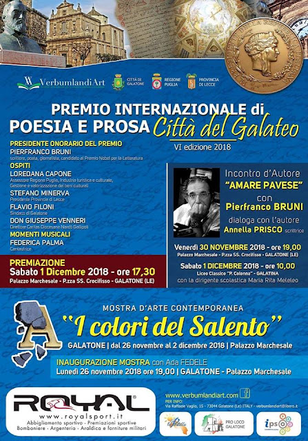 Gran lavoro, dunque, per la Giuria del Premio Letterario nella valutazione della gran mole di opere in poesia e prosa in concorso. Lo scrittore Pierfranco Bruni, candidato al Nobel per la Letteratura, è il Presidente onorario di questa edizione del Premio, mentre la Giuria, presieduta da Massimo Enrico Milone, direttore Rai Vaticano, è composta da Annalena Cimino, Annella Prisco, Camelia Florescu, Carlo Alberto Augieri, Carmen Moscariello, Enrico Romano, Giorgio Rizzo, Goffredo Palmerini, Mirjana Dobrilla, Sergio Camellini, con il cordinamento di Regina Resta, presidente di Verbumlandiart. Le manifestazioni avranno un prologo d’eccezione, venerdì 30 novembre alle ore 19 presso il Palazzo Marchesale di Galatone, con la presentazione del volume “Amare Cesare Pavese” di Pierfranco Bruni. Converserà con l’illustre autore la scrittrice Annella Prisco. Lo scrittore, l’indomani mattina alle 10, sarà ospite del Liceo Classico “P. Colonna” di Galatina, e parlerà con gli studenti presentato dalla dirigente scolastica Maria Rita Meleleo.