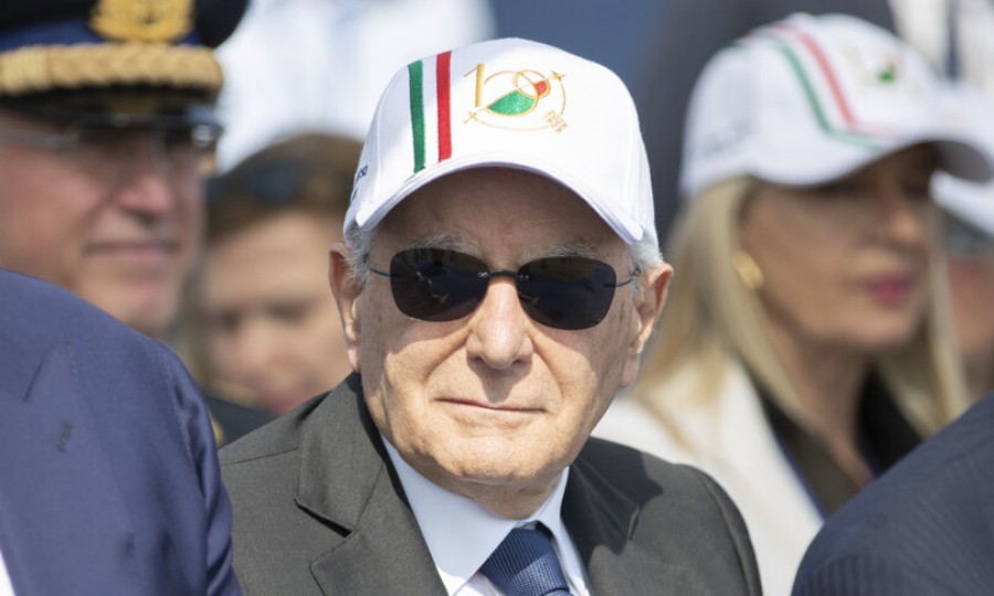 Cappellino bianco dell’Aeronautica, occhiali da sole e cuffie antirumore, Sergio Mattarella ha assistito con il ministro della Difesa Guido Crosetto alle evoluzioni di oltre cento aerei dell’Aeronautica militare per celebrare il Centenario della Forza armata.
