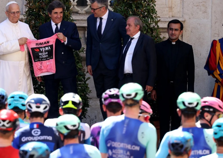 Leone XIV ha ricevuto in dono una maglia Rosa dal presidente di RCS MediaGroupUrbano Cairo (era presente anche il direttore della Corsa RosaMauro Vegnini) e ha poi salutato i vincitori delle classifiche: Simon Yates, maglia Rosa, Mads Perdersen, maglia Ciclamino, Lorenzo Fortunato, maglia Azzurra e Isaac Del Toro, maglia Bianca. AGI
