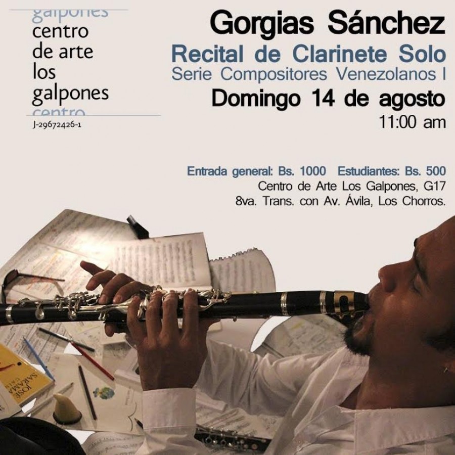 El recital de Gorgias Sánchez de clarinete solo de l Serie de Compositores I, se llevará a cabo el domingo 17 de agosto, las 11:00 a.m., en el Galpón 17 del Centro de Arte Los Galpones. El Valor de las entradas tiene un costo únicamente en efectivo de Bs. 1.500, oo para público en General y de Bs. 500, oo para estudiantes, las cuales pueden adquirirse a la entrada del recital, directamente en el acceso a la sala.